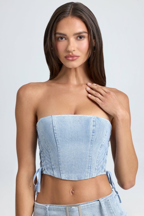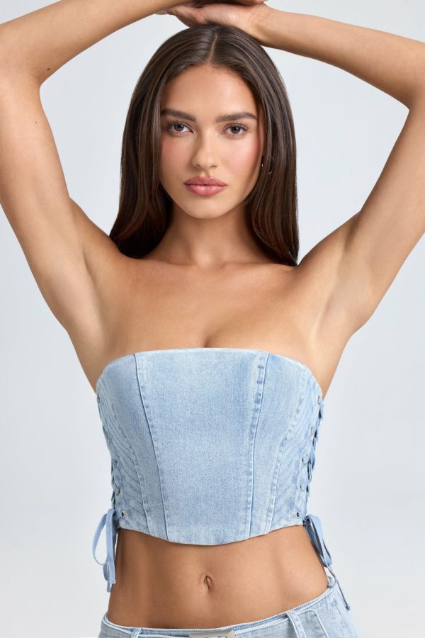 Elevate your double-denim ensemble with the stunning Dalani corset crop top, expertly crafted to deliver both style and sophistication. This premium stretch denim top features a beautifully curved silhouette that enhances your natural shape, complete with a chic bandeau neckline and removable adjustable camisole straps for versatile styling options. The design is accentuated with contemporary moto-inspired quilted panels and signature lace-up detailing on each side for that perfect edgy finish.