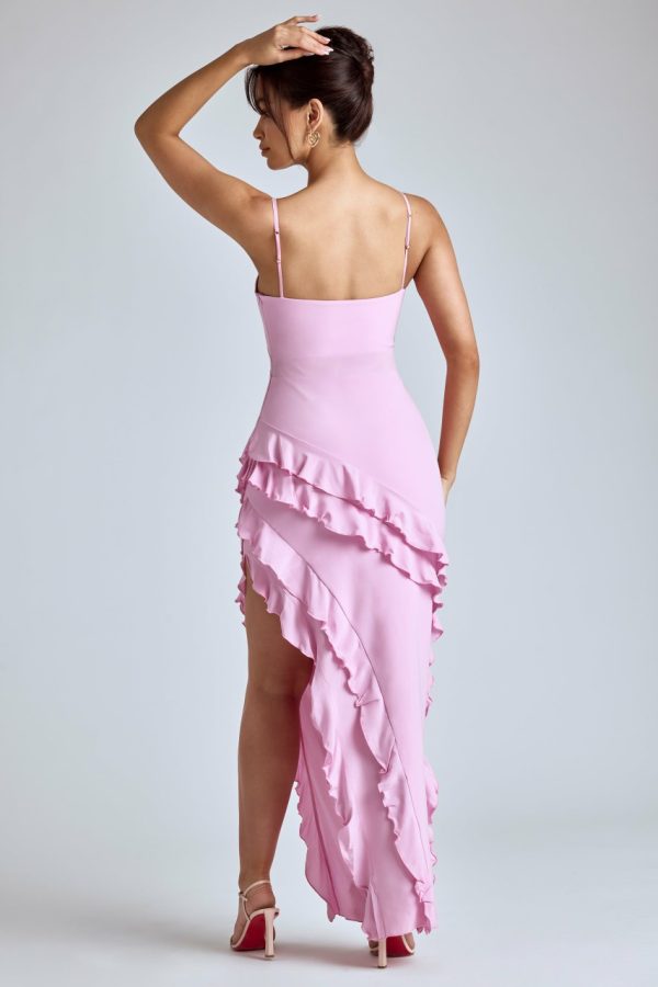 Experience timeless sophistication with the Aurelie gown, crafted for unforgettable evening occasions. This stunning dress features premium stretch georgette fabric shaped into a graceful column silhouette with a figure-flattering V-neckline secured by adjustable straps. Eye-catching ruffle accents elevate the maxi skirt design, complemented by a chic thigh-high split that adds a touch of allure.