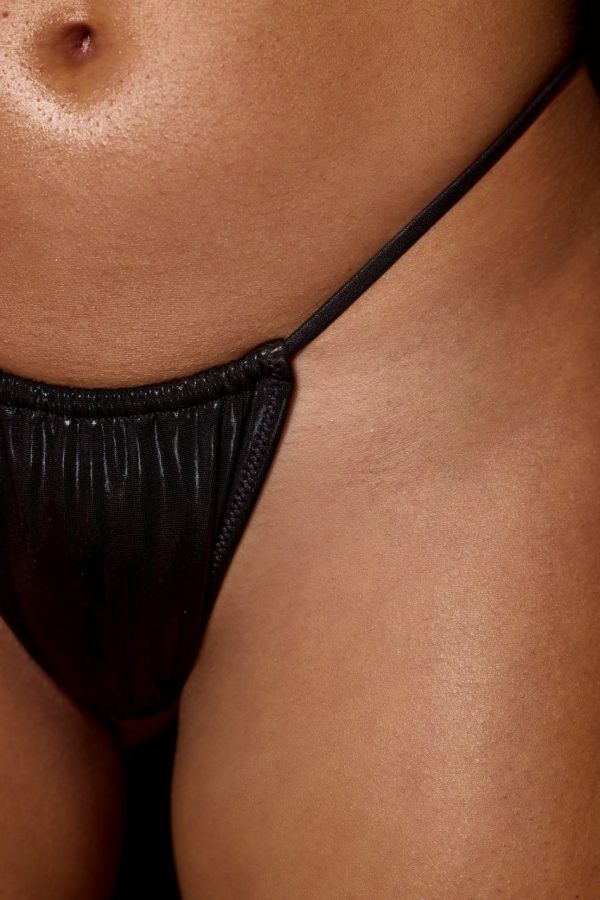 Classic swim silhouettes reinvented by Neena Swim. Designed in our premium metallic swim jersey, these thong bottoms feature an adjustable ruched channel at the front and back that allows you to customize your coverage. Perfect for minimizing tan line, these statement thong bottoms pair perfectly with the Metallic Swim bikini tops.