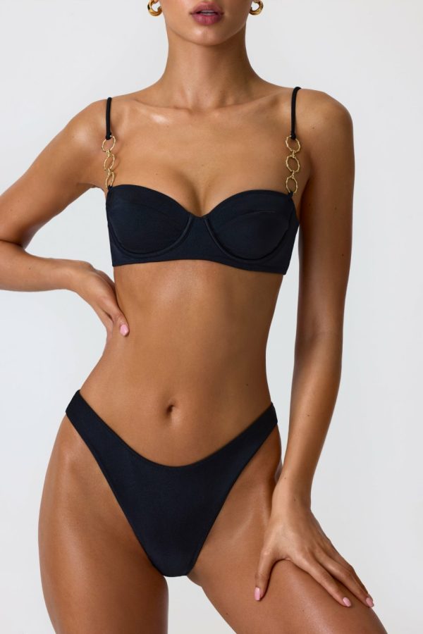 A classic silhouette with a statement twist, this bikini top is secured with gold-tone chain hardware at each strap. Ideal for those with a fuller bust or requiring enhanced support, it’s crafted from stretch-jersey swim fabric to an underwired balconette silhouette with moulded cups. It features adjustable straps and boning at the side seams for elevated comfort.