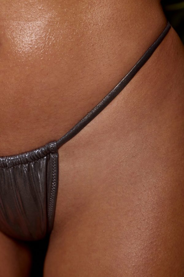 Classic swim silhouettes reinvented by Neena Swim. Designed in our premium metallic swim jersey, these thong bottoms feature an adjustable ruched channel at the front and back that allows you to customize your coverage. Perfect for minimizing tan line, these statement thong bottoms pair perfectly with the Metallic Swim bikini tops.