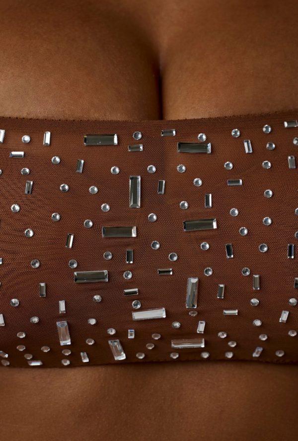 Single layer 20D mesh fabric with delicate hotfix embellishment throughout (85% Polyester, 15% Elastane). Unlined and sheer – we recommend styling with our Oh Polly Intimates range. This garment contains delicate artisanal hand embellishment that may become loose overtime. Additional embellishment has been provided for repairs.