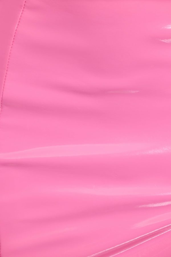 High shine, light vinyl fabric (Shell: 50% Polyurethane, 45% Polyester, 5% Elastane, Lining: 90% Polyester, 10% Elastane). Fully lined. Please read the wash instructions.Model Measurements: Height 5’9″, Bust 32″, Waist 23″, Hips 36″True to size. If you’re between sizes, we recommend sizing up.
