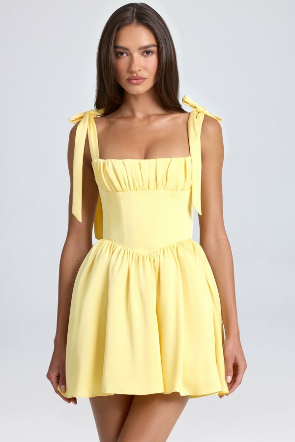 Sweet silhouettes made for social season. A stunning design that’ll take you from day to night, the Bellamy dress is crafted from lustrous lightweight satin with a fitted bodice that cinches the waist and a voluminous mini-length skirt. It’s framed with a straight neckline enhanced with delicate pleats, functional shoulder ties and signature lace-up back detailing that can be adjusted for your perfect fit.