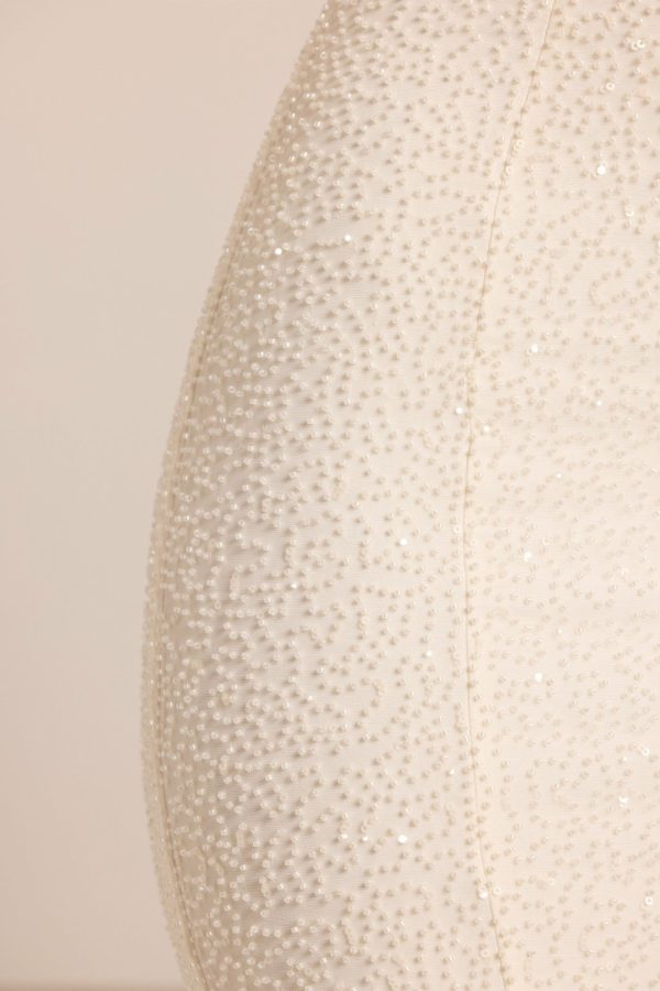 Dual layered mesh fabric with fully seeded embellishment throughout (Shell: 84% Polyester, 16% Elastane, Lining: 95% Polyester, 5% Elastane). Fully lined. This garment contains delicate artisanal hand embellishment and it is normal that overtime embellishment may become loose. Additional embellishment has been provided for repairs.