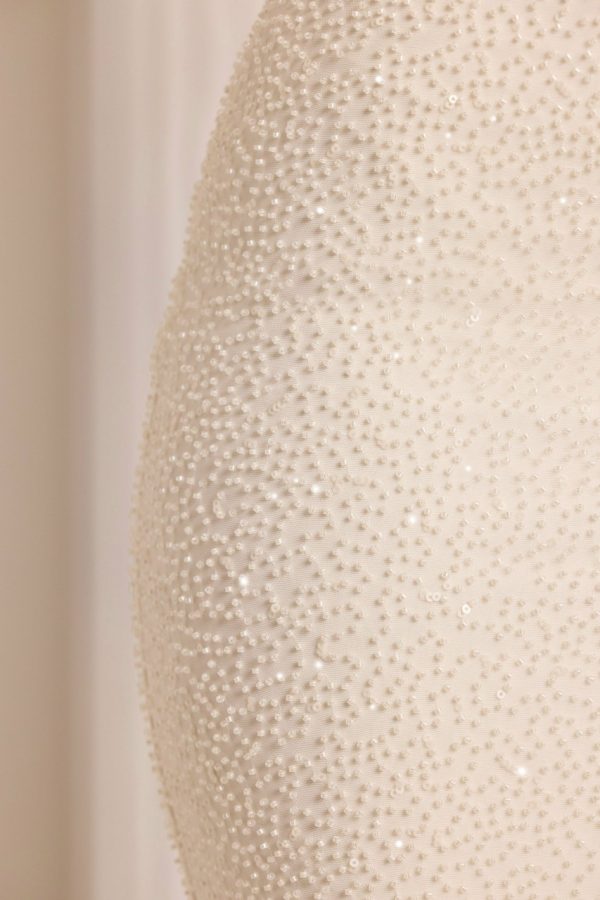 - Fully embellished with seeded beading