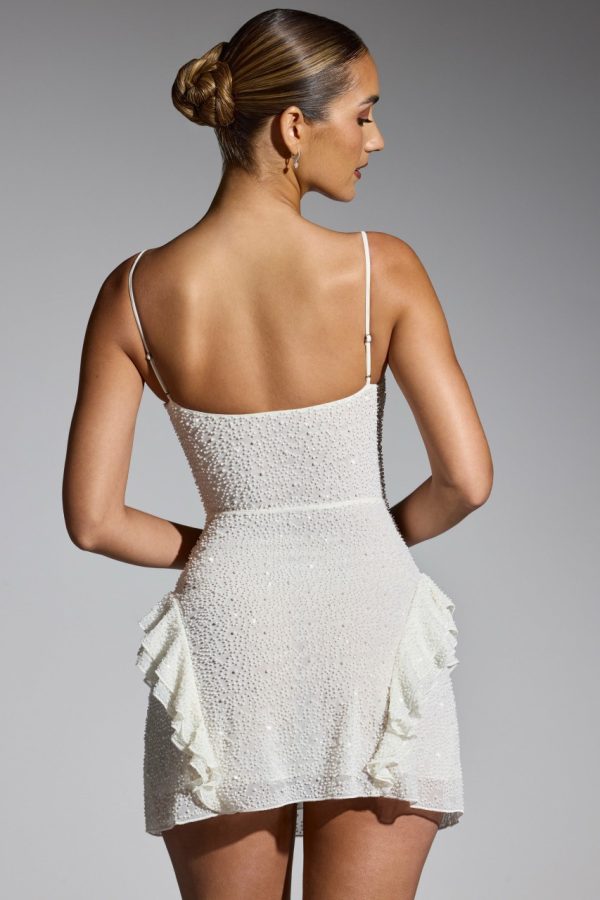 Feminine and flirtatious, the Domblans mini dress is cut from our premium dual-layered mesh fabric and features all-over embellishment. Perfect for sparkling under dance floor spotlights, Domblans showcases bead and crystal adornments, a flattering curved neckline, and ruffle detailing at the hips.