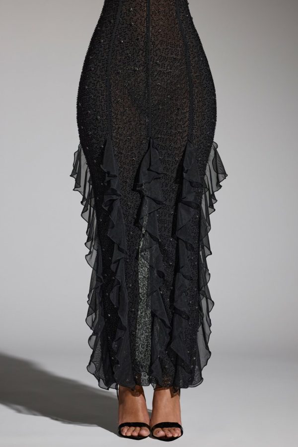 A perfect balance of sultry and feminine, the Anley maxi dress is timeless. Designed in our premium 20D mesh fabric, Anley features all-over bead and crystal embellishment, a plunging halter neckline, and frill detailing from the hips to hemline.