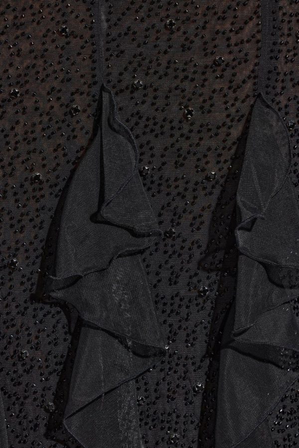 Dual layered 20D mesh fabric with seeded bead and riveted crystal embellishment throughout (84% Polyester, 16% Elastane). Fully lined yet semi sheer. This garment contains delicate hand embellishment and it is normal that over time embellishment may become loose. Additional embellishment has been provided for repairs. Due to the delicate nature of this garment, this should be dry cleaned only. Model Measurements: Height 5’9″, Bust 32″, Waist 23″, Hips 36″ and Priscilla wears a UK size 4.