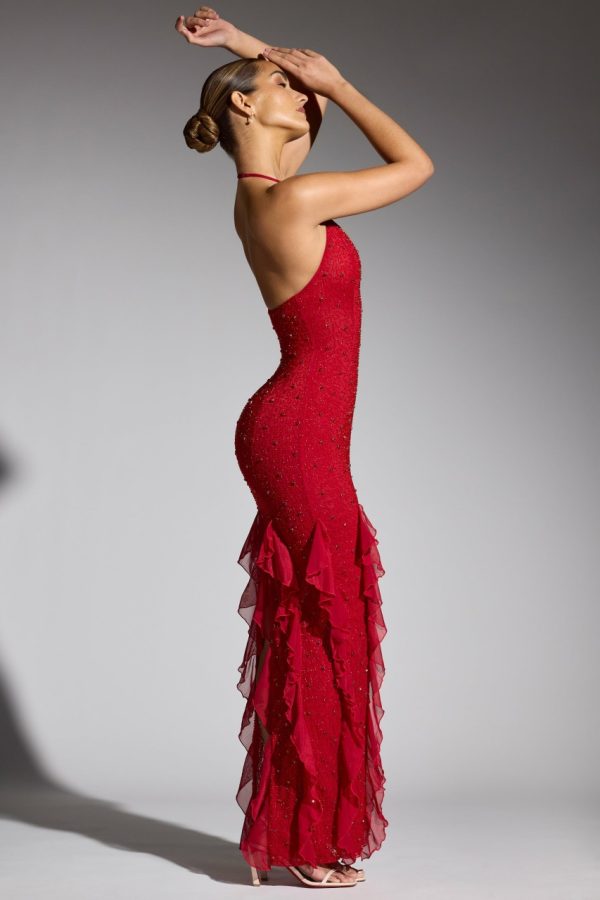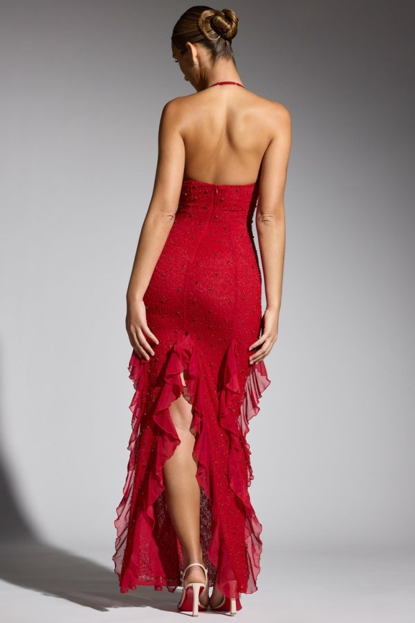 A perfect balance of sultry and feminine, the Anley maxi dress is timeless. Designed in our premium 20D mesh fabric, Anley features all-over bead and crystal embellishment, a plunging halter neckline, and frill detailing from the hips to hemline.