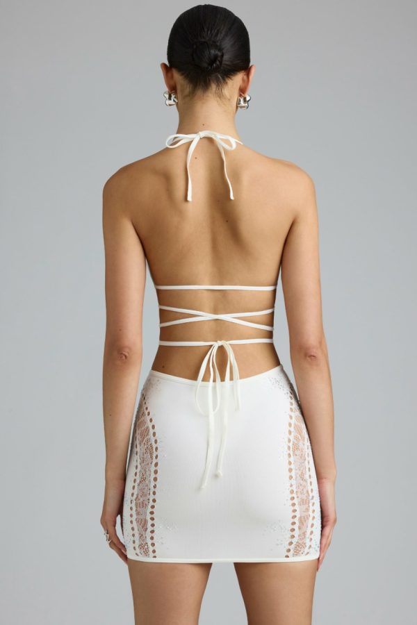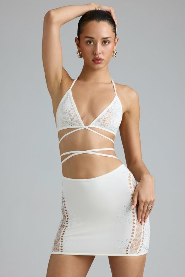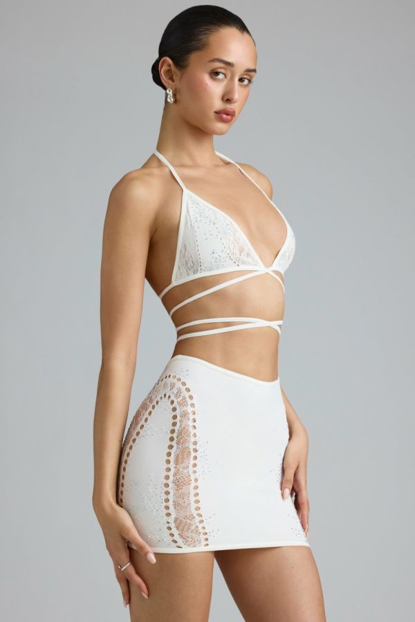 Elevate your festival wardrobe with the stunning Joni mini skirt. This versatile piece creates eye-catching experimental outfits, crafted from our premium seamless knit fabric that contours to your curves for exceptional support and shape. Designed with a flattering mid-rise fit, it features exquisite lace panels and precision laser-cut details that enhance the sculpted silhouette, complemented by strategically placed rhinestone embellishments for dazzling appeal.