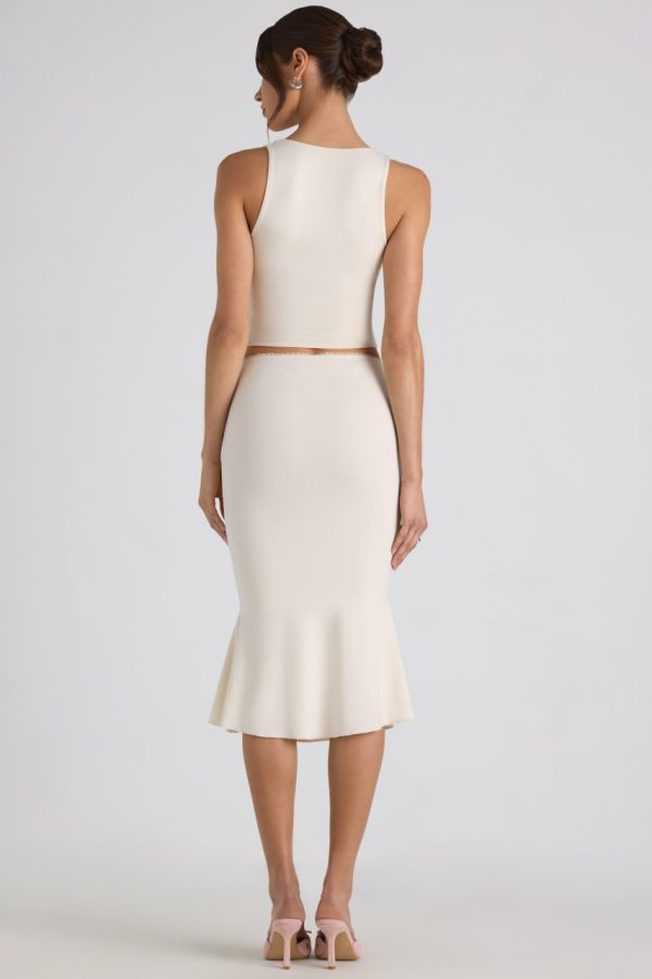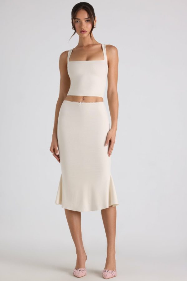 Elegant and timeless. Perfectly designed for your spring wardrobe, the Geena midi skirt features ultra-soft jersey crafted with TENCEL™ Modal – a premium fiber made from renewable beechwood sourced from sustainable forests. Cut in a classic fit-and-flare silhouette with an elasticated waistband for all-day comfort. The delicate lace trim and bow detailing capture the collection’s romantic charm.