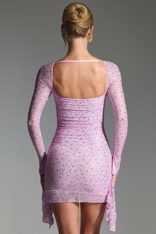 Oh Polly Long Sleeve Dresses | Embellished Draped Cowl-Neck Mini Dress In Peony Pink – Women