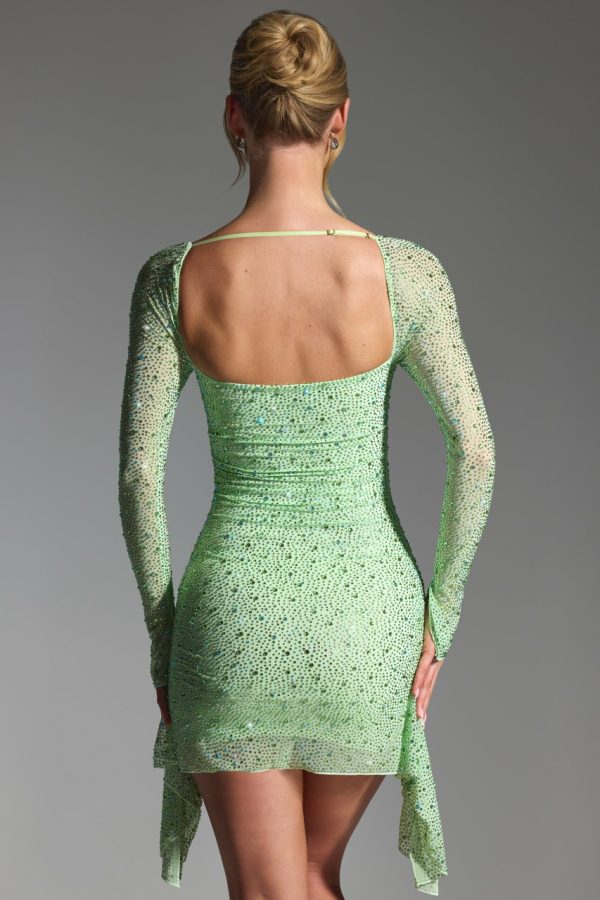 The perfect complement to glitzy evenings. Imagined in our London atelier and crafted from premium 20D mesh with a touch of stretch, the Marilla mini dress is cut to a figure-skimming bodycon silhouette with a square neckline. It’s framed with long sleeves, waterfall draped detailing at the hem and embellished with scores of sparkling HOTFIX embellishments for a statement look.