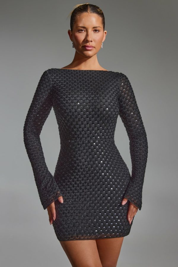 Designed to turn heads at any event, the Grazina mini dress is adorned with unique scalloped crystal embellishments that twinkle under spotlights. It’s cut from figure-hugging double-layered power mesh to a universally flattering A-line silhouette, complete with a sultry low back. It’s framed with a high boat neck and long flared sleeves for a chic twist.