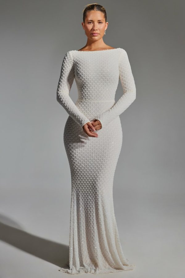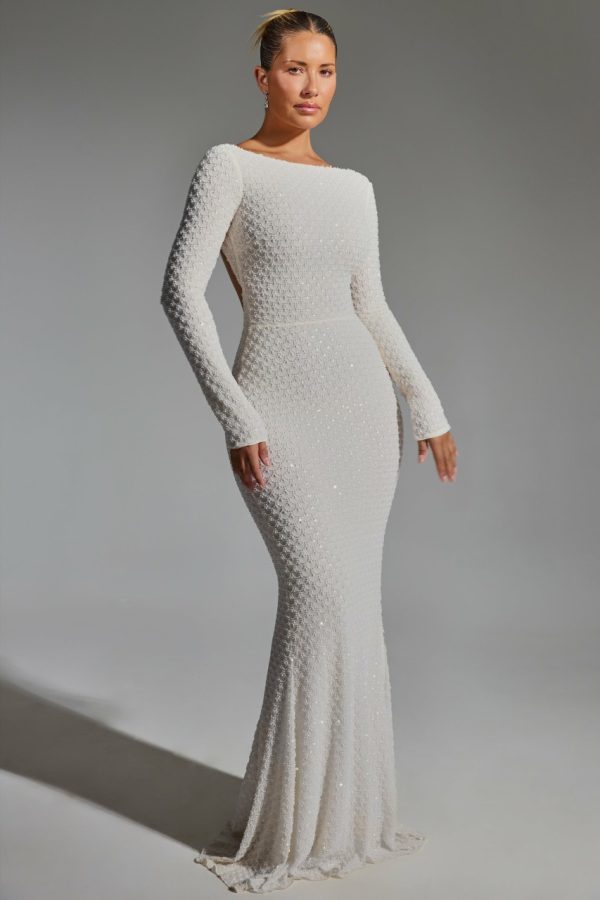 Classic elegance with a signature twist. Modelled on timeless styles, the Jailene gown is cut from double-layered premium power mesh to a stunning fishtail silhouette framed with a high boat neck. It’s adorned with unique scalloped crystal embellishments and turns to reveal a statement open back, complete with an adjustable horizontal strap for a custom fit and perfectly positioned ruching at the back for enhanced shaping.