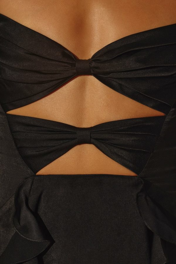 Designed in our premium Cupro satin fabric for a delicate and romantic feel, the Adira mini dress was designed with a sweetheart neckline, bell sleeves, and ruffles at the skirt. Complete with a lace-up back and bow detailing at the front of the bodice, Adira is the statement mini dress of our Fall collection.