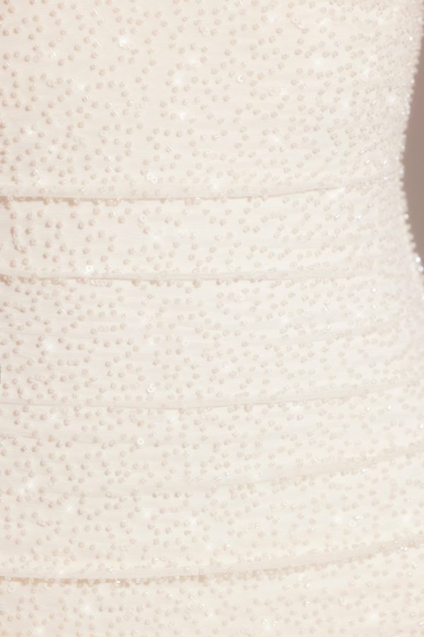 Dual layered mesh fabric with fully seeded embellishment throughout (Shell: 84% Polyester, 16% Elastane, Lining: 95% Polyester, 5% Elastane). Fully lined. Please read the wash instructions.Model Measurements: Height 5’9″, Bust 31.5”, Waist 22.5”, Hips 35.5”