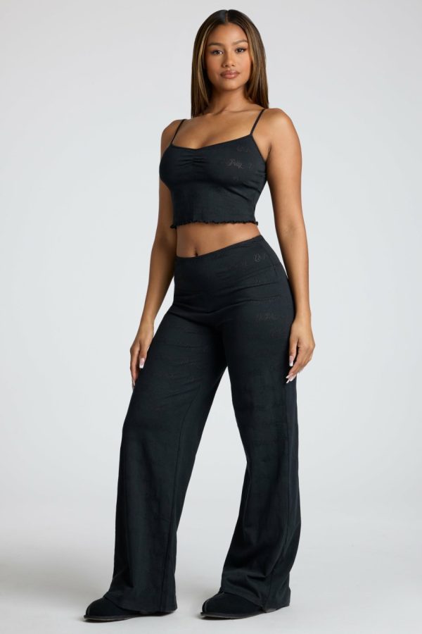 Experience ultimate comfort with our effortlessly chic lounge trousers that you’ll want to live in. Crafted from our premium lightweight pointelle jersey fabric with just the right amount of stretch, these trousers feature subtle Oh Polly embossed branding for a touch of sophistication. Perfect for relaxed days at home or casual outings, these versatile bottoms combine comfort with style through their flattering mid-rise waistband, contemporary straight leg silhouette, and delicate lettuce hem detailing.