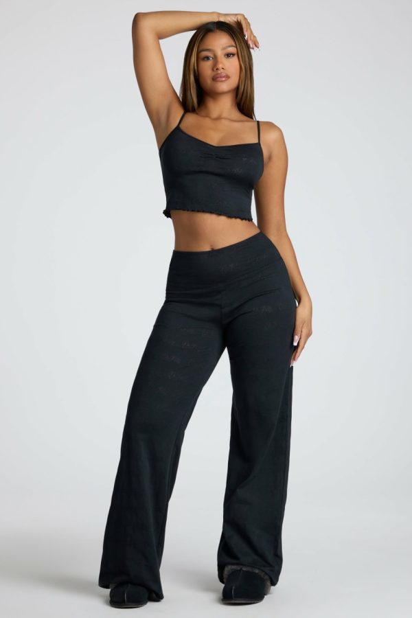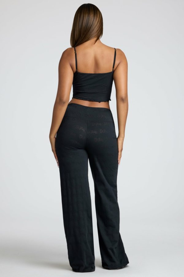 Experience ultimate comfort with our premium lounge trousers you’ll want to live in. Crafted from our signature lightweight stretch pointelle jersey fabric, these trousers feature subtle Oh Polly embossed branding throughout. Perfect for relaxed days at home, these versatile bottoms combine comfort with style through a flattering mid-rise waistband, contemporary straight leg silhouette, and delicate lettuce hem detailing.