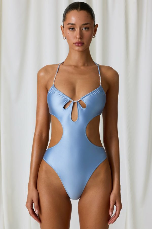 Beach-to-bar styling. Ideal for styling with a coordinating cover-up from the collection for a complete look, the Melo Melo swimsuit is a statement design elevated with cut-out detailing at the front, waist and back. It’s crafted from custom-developed stretch-tricot swim fabric with a glossy satin finish to a high-cut, halterneck silhouette, complete with lustrous faux-pearl detailing.