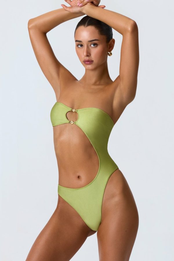 Elevate your resort wardrobe with this stunning one-piece that transitions effortlessly from sun-drenched beach days to warm evening gatherings. Expertly crafted from premium stretch-jersey swim fabric that contours and enhances your silhouette, this bandeau swimsuit features strategically placed curved side and bust cut-outs accentuated with signature gold-tone shell hardware for a truly eye-catching finish.