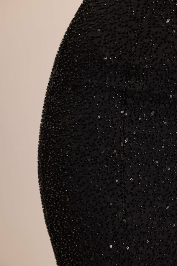 Dual layered mesh fabric with fully seeded embellishment throughout (Shell: 84% Polyester, 16% Elastane, Lining: 95% Polyester, 5% Elastane). Fully lined. This garment contains delicate artisanal hand embellishment and it is normal that overtime embellishment may become loose. Additional embellishment has been provided for repairs.