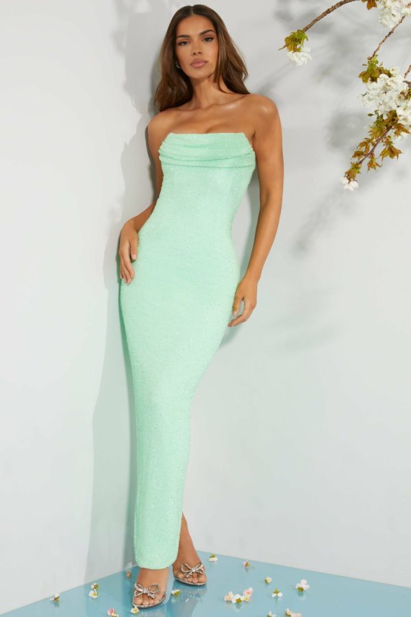 A variation of our most loved La Rochette maxi dress, the Palermo bandeau maxi is a sleek and seductive staple that offers more coverage. Designed in our premium stretch mesh fabric that’s fully embellished with pearl and bead adornment for extravagant glamor, the Palermo maxi has a bust flattering bandeau cowl neckline. Cut to a maxi length with a narrow split on reverse that allows for ease of movement, the Palermo maxi dress is an essential style for elegant evening dressing.