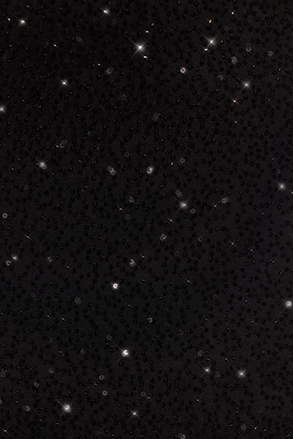 Dual layered mesh fabric with fully seeded embellishment throughout (Shell: 84% Polyester, 16% Elastane, Lining: 95% Polyester, 5% Elastane). Fully lined. Please read the wash instructions.Model Measurements: Height 5’9″, Bust 31.5”, Waist 22.5”, Hips 35.5”
