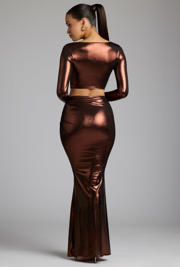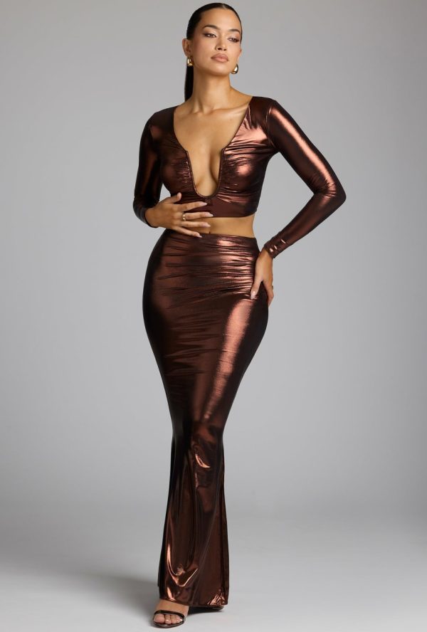 Create a memorable two-piece look with the Zahra gown skirt. A statement separate designed in our premium metallic jersey fabric, Zahra is cut close around the hips with curve-accentuating ruching and power mesh lining. Its maxi length and flattering fishtail silhouette effortlessly complements the Rana crop top.
