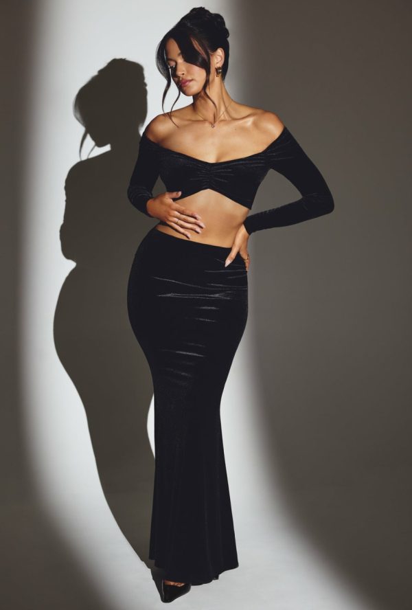 A timeless evening staple, the Nixie mid-rise maxi skirt is designed in our premium, ultra-soft velvet fabric. With side ruching at the hips and an elasticated waistband, the Nixie maxi skirt graduates into an elegant fishtail hem. Pair yours with our matching Adele off-the-shoulder top.